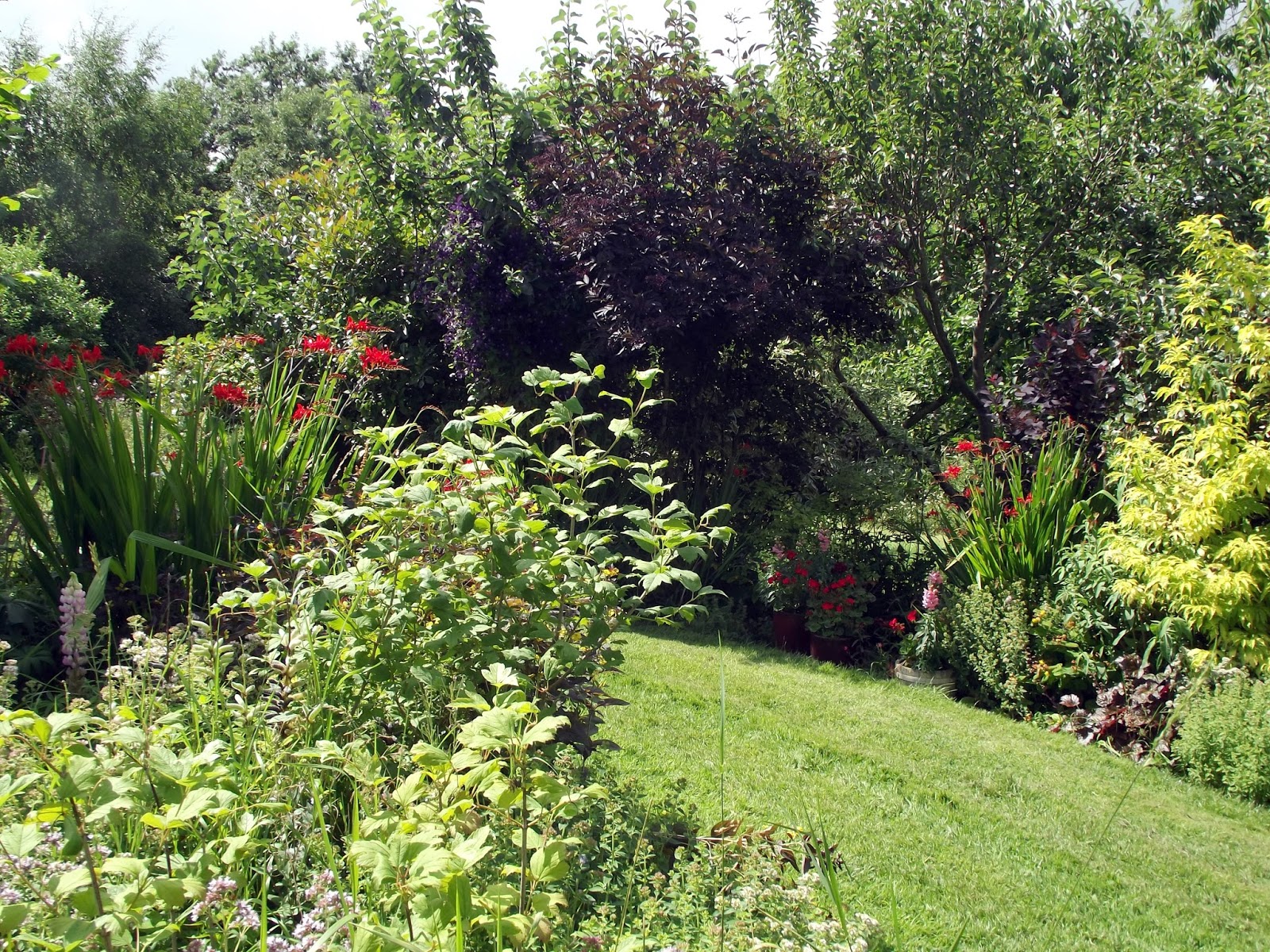 Das Stück im langen Beet wo ich gerne ein bisschen rote Farbe sehe wird nun aufgeheitert von Crocosmia Lucifer, prima!