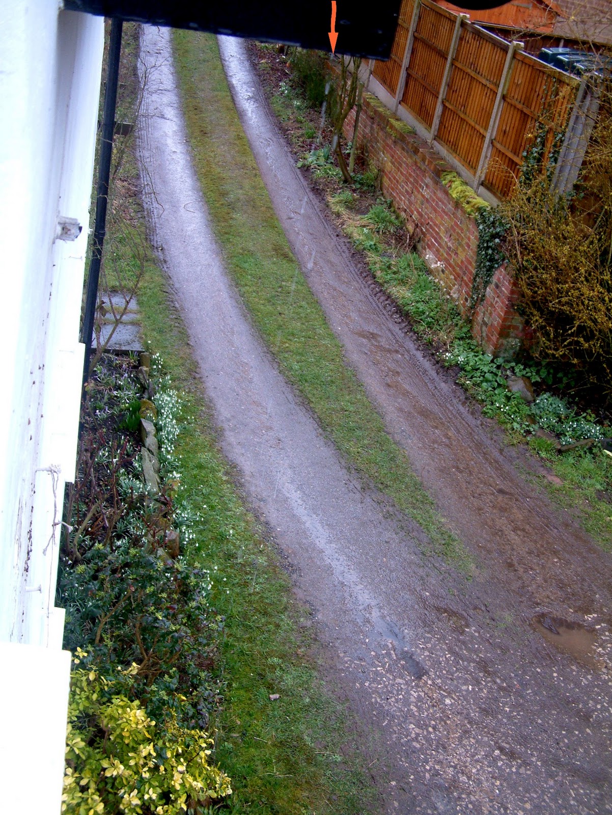 Auch auf diesem Bild links ist ein Pfeil - könnt ihr sehen wie das Wasser vom Dach tropft wo das Abflussrohr immer noch fehlt?