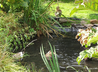 Die meiste Zeit am Tage verbringen unsere Enten und Erpel am und im größten Teich, aber wie ihr an den Bildern oben gesehen habt gehen sie immer noch manchmal in den vorderen Garten, und zum Froschteich kommen sie auch, gewöhnlich nachmittags: